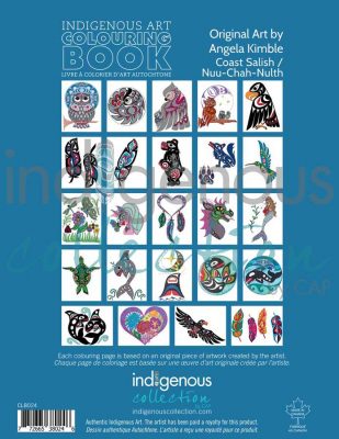 Authentic Indigenous Art. Artists cultural background: Coast Salish Each 8.5 x 11 coloring book features 28 coloring pages based on original pieces of artwork created by the artist; plus information on the artists cultural background, the artists biography and photos. The back cover highlights the original art for reference. The artist or copyright holder has been paid a royalty for the sale of this product. Made in Canada.