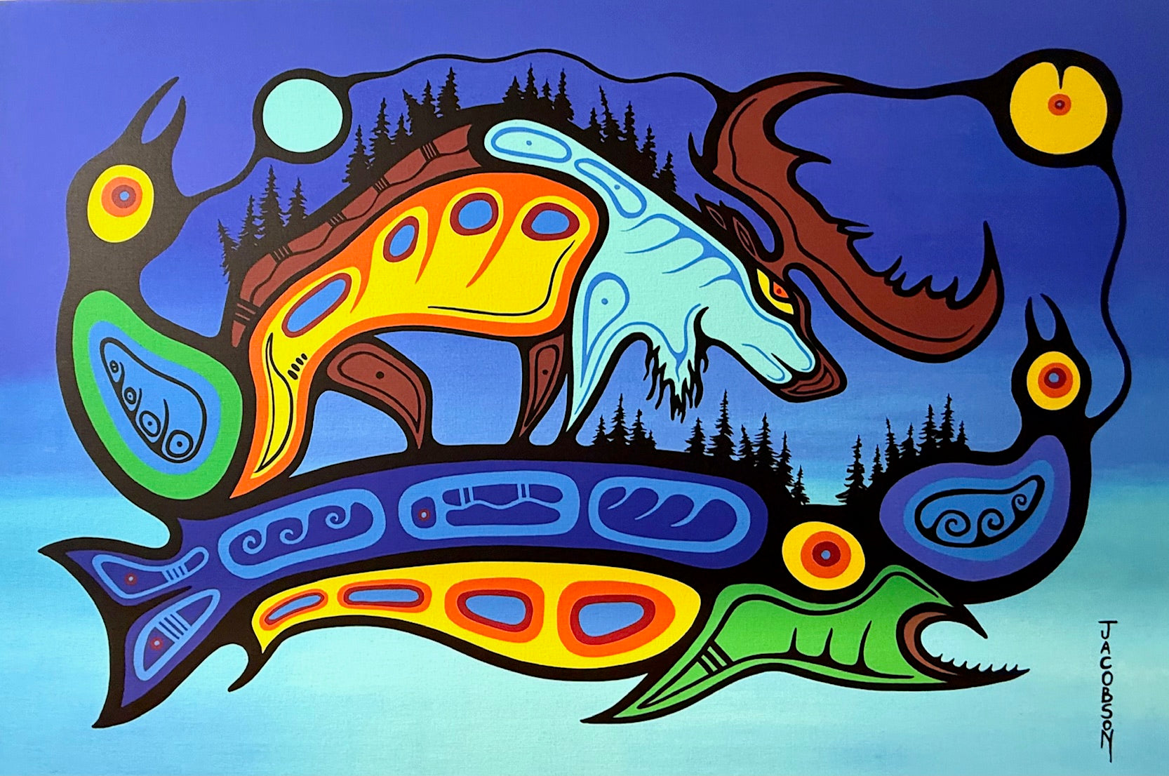 Mark Anthony Jacobson is a Woodland artist from Sioux Lookout, Ontario, who currently works and lives in British Columbia. A self-taught Aboriginal artist, he discovered at a young age that the Creator blessed him with the artistic ability known as the Woodland Art Movement.
