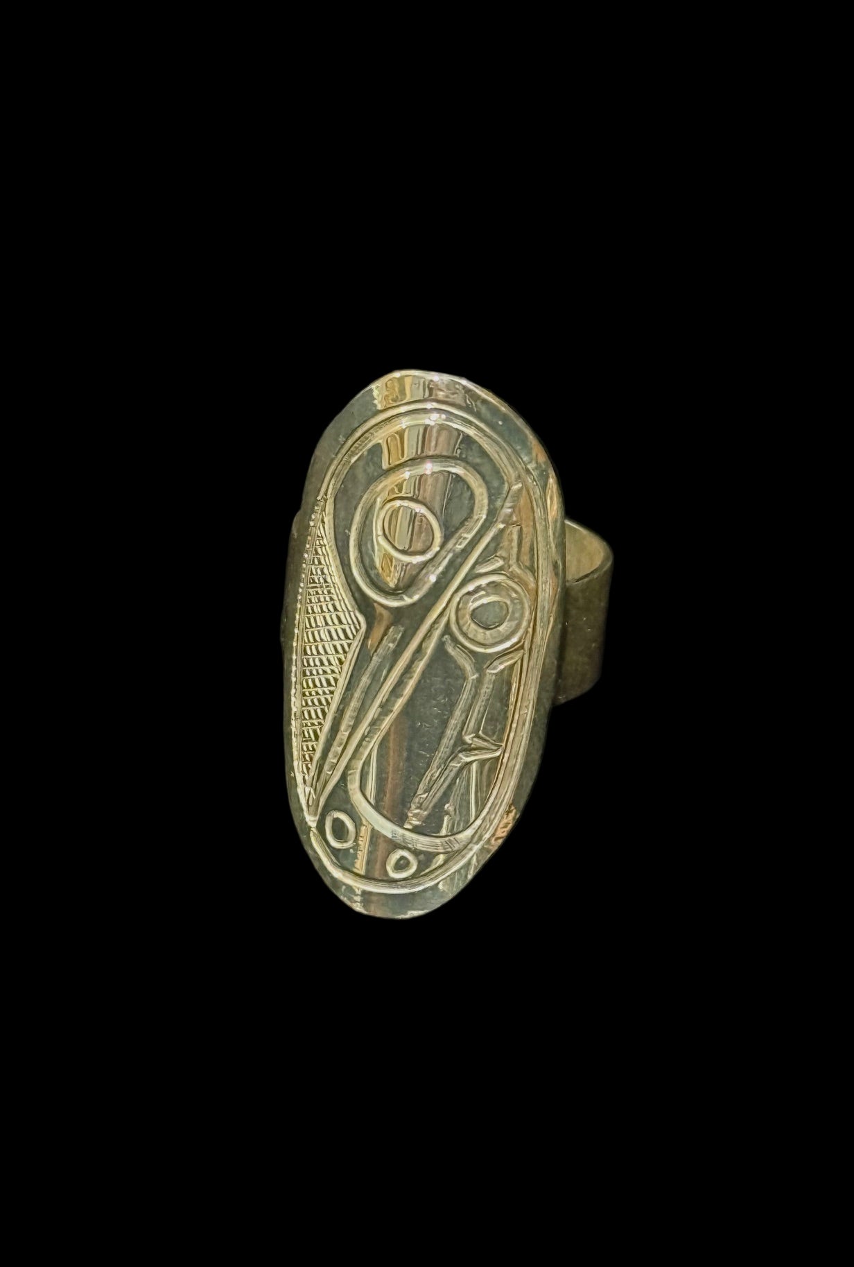 Norman Seaweed was born in Alert Bay, a picturesque fishing village on the northeastern coast of Vancouver Island. This region represents the Kwagiulth Nation, a tribe primarily located in the southern part of the province. His mother’s family is from Village Island, and his father’s family is from Turnour Island. In 1978, Norman trained in jewelry carving under Lloyd Wadhams. He had a deep interest in drawing, which led him to wood carving and eventually to working with silver and gold. Norman’s brothers, Alfred, Paddy, and Rodney, are all skilled silver carvers.
