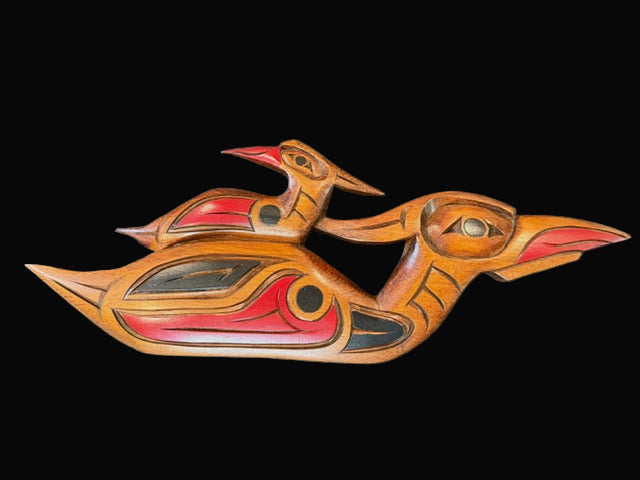 This is a lovely small carving of a loon hen with a chick perch on its back, with the other trailing behind