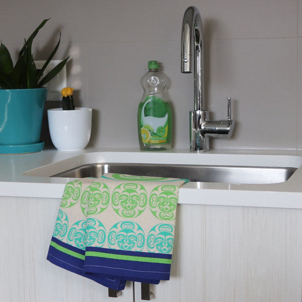 This printed tea towel features a striking Indigenous design, that beautifully matches our Porcelain Art Collection. Made from 100% unbleached cotton and printed with water-based non-toxic inks, this 27.5" x 20" towel is both stylish and functional — ideal for drying dishes or adding a pop of colour to your kitchen.