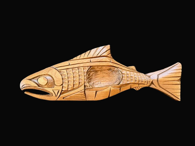 The salmon represents abundance, fertility, prosperity, and renewal. It is considered a life source, essential for the sustenance of both animals and humans. Some Pacific Northwest coast cultures hold the belief that salmon are immortal beings dwelling in underwater villages. According to legend, in spring, these beings don the guise of salmon to sacrifice themselves as nourishment for humans. Often, salmon are portrayed in art as circular pairs, signifying the continuity of life's cycle.