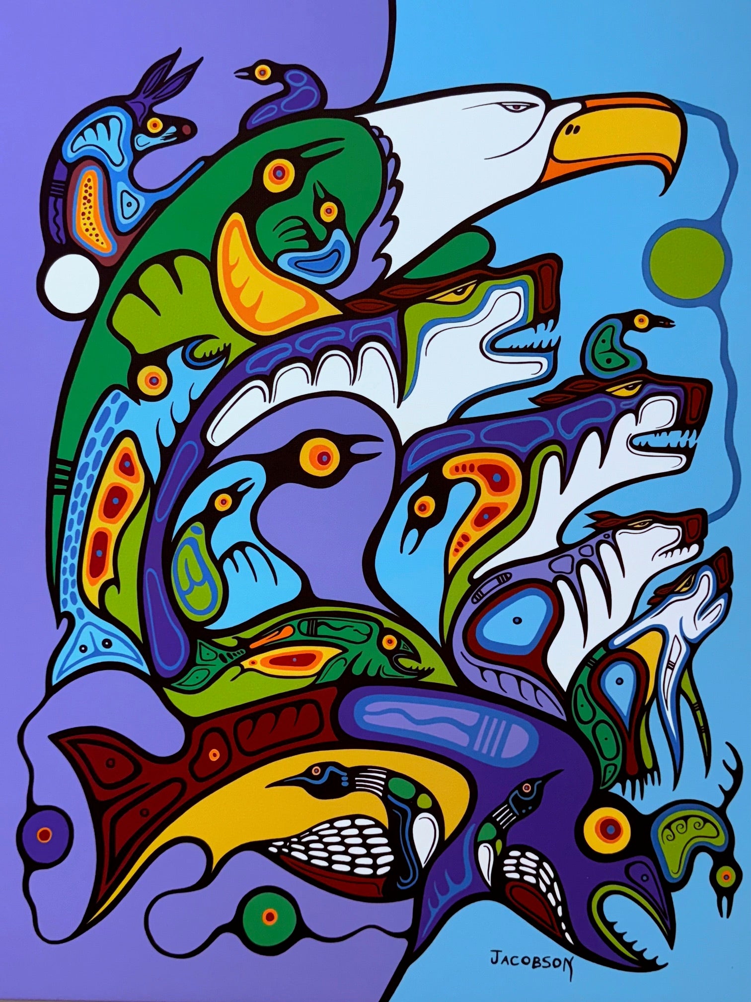 Mark Anthony Jacobson is a Woodland artist from Sioux Lookout, Ontario, who currently works and lives in British Columbia. A self-taught Aboriginal artist, he discovered at a young age that the Creator blessed him with the artistic ability known as the Woodland Art Movement.